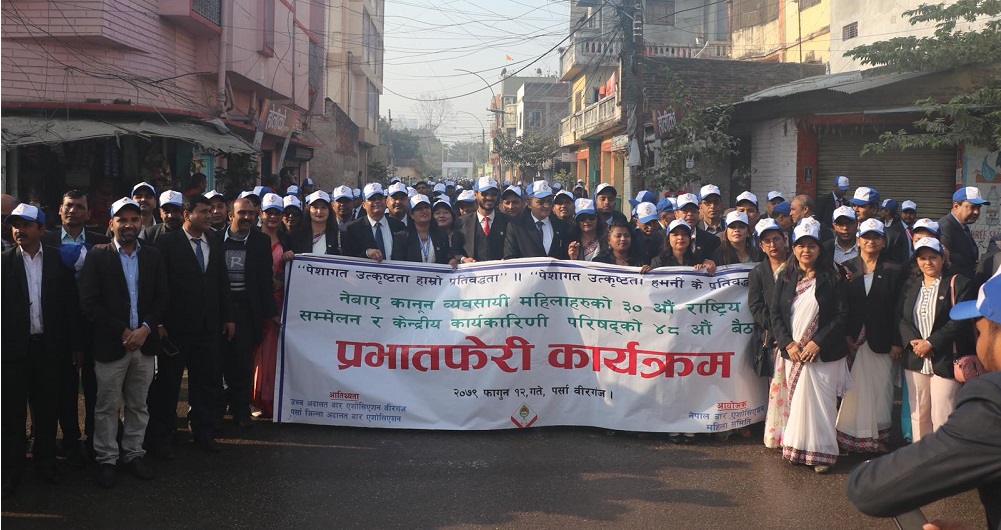 वीरगञ्ज । कानुन व्यवसायी महिलाको ३०औँ राष्ट्रिय सम्मेलन आज (शुक्रबार)देखि पर्साको वीरगञ्जमा सुरु हुँदैछ । त्यस अवसरमा आज बिहान यहाँ प्रभातफेरी गरिएको छ । सम्मेलनका अवसरमा वीरगञ्जको घण्टाघरबाट सम्मेलनस्थल टाउन हलसम्म प्रभातफेरी गरिएको छ । सम्मेलनको कामु प्रधानन्यायाधीश हरिकृष्ण कार्कीले उद्घाटन गर्ने कार्यक्रम छ ।