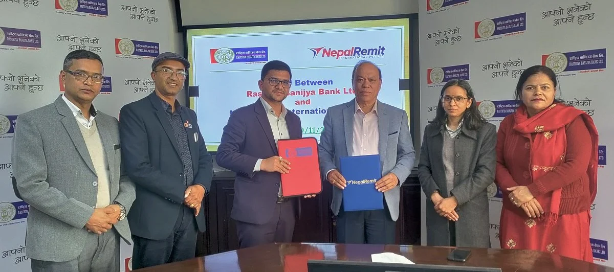 काठमाडौं । राष्ट्रिय वाणिज्य बैंक लिमिटेड र नेपाल रेमिट इन्टरनेशनल प्रालिबीच वैदेशिक रेमिट्रयान्स बैंकिङ्ग च्यानल मार्फत भुक्तानी गर्ने सम्बन्धमा सम्झौता भएको छ । सम्झौता पत्रमा बैंकका प्रमुख कार्यकारी अधिकृत किरणकुमार श्रेष्ठ र नेपाल रेमिटका प्रमुख कार्यकारी अधिकृत सागर खनालले हस्ताक्षर गरेका छन् ।