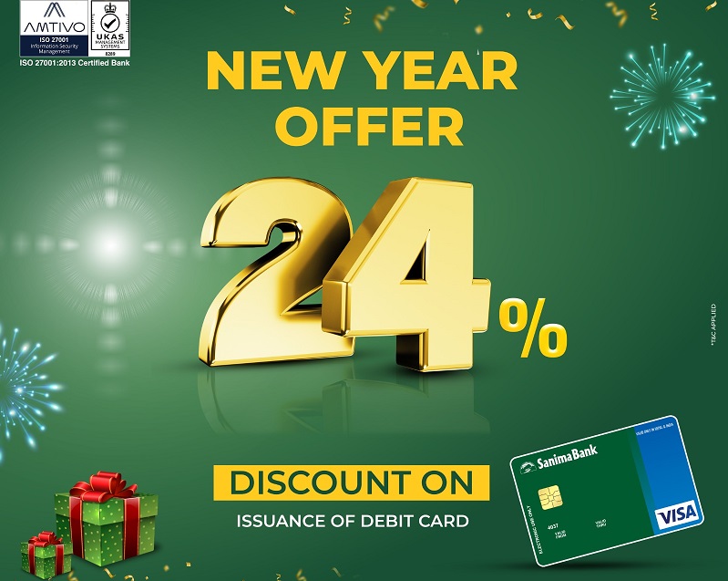 काठमाडाैं ।  सानिमा बैंकले नयाँ वर्ष २०२४ को विशेष अवसरमा ग्राहकहरूका लागि छुट अफरको घोषणा गरेको छ । पर्सि आइतवारदेखि माघ ११ गतेसम्म चल्ने योजना अवधिभर सानिमा डोमेस्टिक डेबिट कार्डको आवेदन दिने ग्राहकहरूले जारी शुल्कमा २४ प्रतिशतको छुट प्राप्त गर्ने बैंकले जनाएकाे छ ।