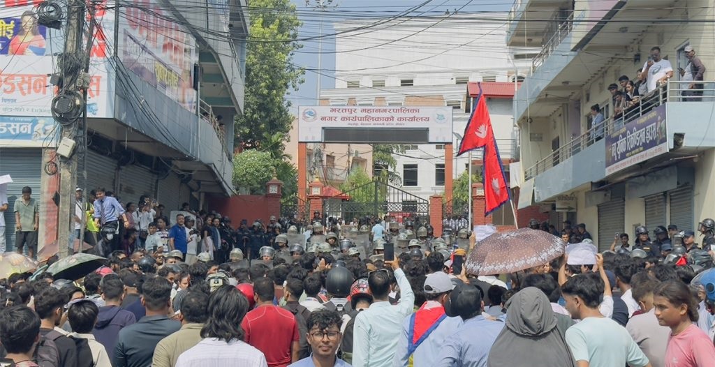 सामाजिक सञ्जालमाथि सरकारले लगाएको प्रतिबन्ध र भ्रष्टाचार विरुद्ध आन्दोलित जेनजीले भरतपुर महानगरपालिकाको कार्यालयमा ढुंगामुढा गरेपछि भिडलाई नियन्त्रणमा लिन अश्रुग्यास प्रहार गर्नुपरेको चितवनका सहायक प्रमुख जिल्ला अधिकारी चिरञ्जीवी शर्माले अनलाइनखबरलाई जानारी दिए । महानगरपालिका कार्यालयभित्र प्रवेश गरेर प्रदर्शनकारीले तोडफोड गर्ने प्रयास गरेपछि प्रहरीले अश्रुग्यास प्रहार गर्नुपरेको उनले बताए । अश्रुग्यास प्रहारपछि प्रदर्शनकारीहरू अहिले तितरबितर बनेको उनले बताए । प्रदर्शनकारीले महानगरपालिका कार्यालयभित्र तोडफोड गर्न खोजेपछि दुई पक्षका बीचमा झडप समेत भएको थियो । अहिले ठूलो संख्यामा महानगरपालिका अगाडि प्रहरी परिचालन गरिएको छ । बिहानसम्म शान्त रहेको भरतपुरमा केही प्रर्दशनकारीले जिल्ला प्रशासन कार्यालय अगाडि एक घण्टा प्रर्दशन गरेर फर्किएका थिए । दिउँसो साढे १ बजेपछि प्रर्दशनकारीहरू महानगरपालिका अगाडि जम्मा भएर प्रर्दशन थालेका हुन् ।