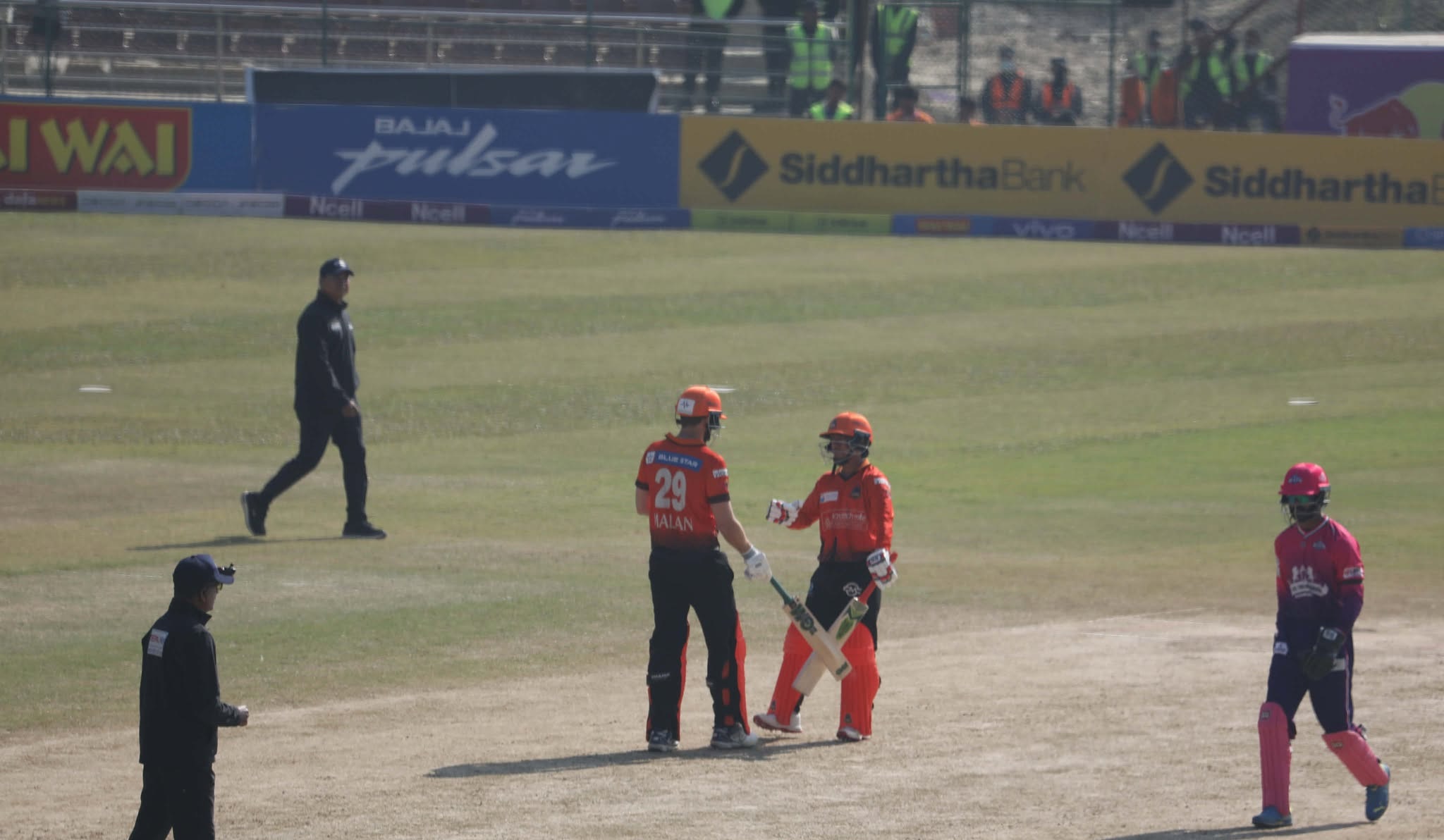 यी दुईबिच पहिलो विकेटका लागि १ सय १२ रनको साझेदारी भएको थियो। मध्यक्रममा ब्याटिङका लागि आएका कप्तान कुशल मल्लले १४ बलमा ३० रनको अर्धशतकीय अविजित इनिङ खेले। जनकपुरका लागि मज सदाक, अनिल साहा, रुपेश सिंह र जन निकोल लोफ्टाइ इटोनले १-१ विकेट लिएका थिए।