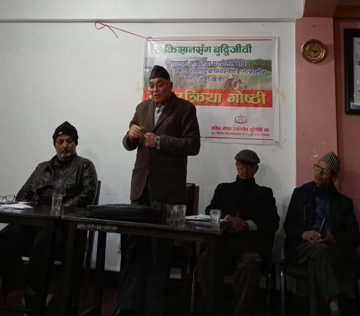 काठमाण्डौ । नेपाल कम्युनिष्ट पार्टीले आगामी पौष ११ गते आयोजना गर्न लागेको किसान भेलाको सन्दर्भमा अखिल नेपाल प्रगतिशील बुद्धिजीवी संघको आयोजनमामा हिजो मंसिर २७ गते राजधानीमा किसानसँग बुद्धिजीवी बिषय एक महत्वपूर्ण कार्यक्रम सम्पन्न भयो । नेपाल कम्युनिष्ट पार्टीको बुद्धिजीवी संगठन अखिल नेपाल प्रगतिशील बुद्धिजीवी संघको आयोजनमा सम्पन्न कार्यक्रममा बिभिन्न बक्ताहरुले देशको अबस्था, नेपाली कृषि र किसानका समस्या र खोजिनु पर्ने निराकरणका बारेमा बोल्नु हुँदै नेपाली कृषि र किसानका तत्कालीन र दीर्घकालीन प्रकृतिका समस्या हल नभई नेपाली राष्ट्रले भोगिरहेका आन्तरिक र बाह्य समस्या पनि हल हुँदैनन् र नेपाली क्रान्तिको कार्यभार पनि पूरा हुँदैन भन्ने निष्कर्श निकालेका छन् ।