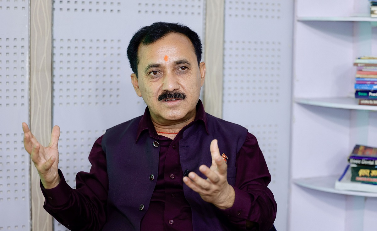 रासससँग कुराकानी गर्नुहुँदै प्रतिनिधिसभाका सदस्य एवं नेपाली कांग्रेसका महामन्त्री विश्वप्रकाश शर्मा । तस्बिर : गोपाल दाहाल / रासस