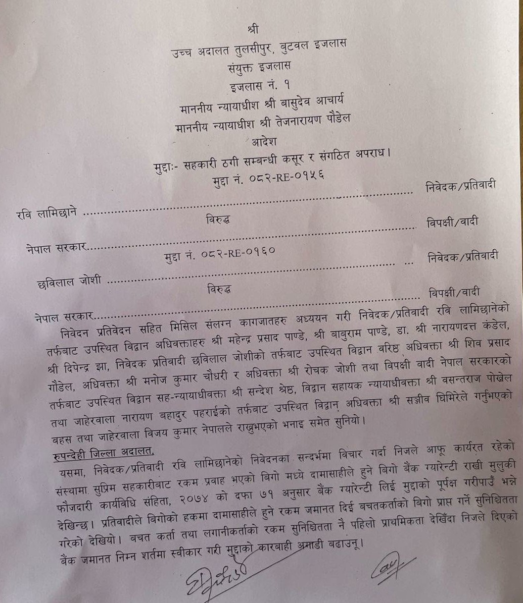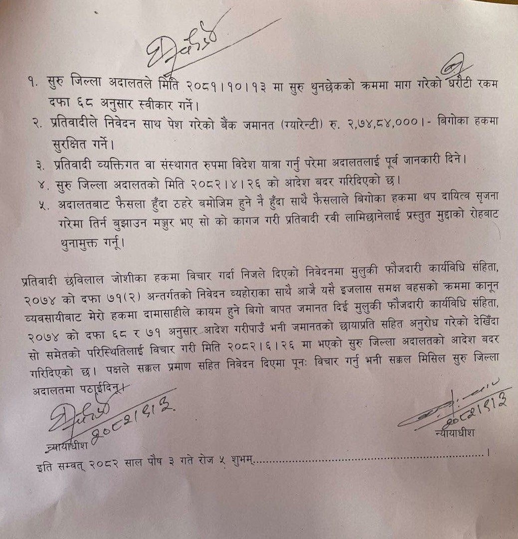 अदालतले लामिछानेलाई ०८१ माघ १३ मा सुरु थुनछेकको क्रममा माग गरेको धरौटी स्वीकार गर्ने र २ करोड ७४ लाख ८४ हजार रुपैयाँ बिगोका हकमा सुरक्षित गर्ने शर्त राखेको छ ।