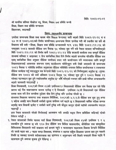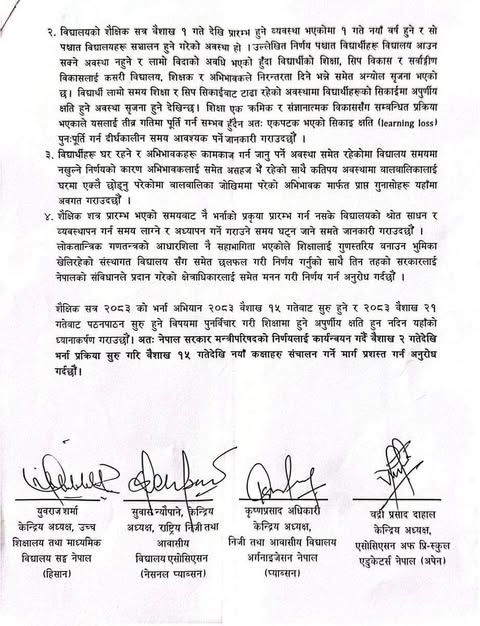आज(बुधबार)शिक्षा, विज्ञान तथा प्रविधि मन्त्रालयलाई सम्बोधन गर्दै जारी गरिएको संयुक्त पत्रमा शिक्षा तथा मानव स्रोत विकास केन्द्रको निर्णयअनुसार वैशाख १५ गतेदेखि शैक्षिक सत्र सुरु गर्ने तथा शनिबार–आइतबार सार्वजनिक बिदा दिने व्यवस्था कार्यान्वयन गर्दा विद्यालय सञ्चालनमा व्यावहारिक समस्या आउने उल्लेख गरिएको छ।